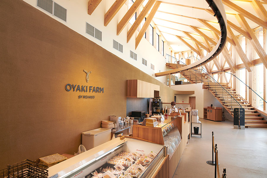 2022 年には「日本に『おやきのある暮らし』を提案する」というビジョンのもと、「OYAKI FARM」をオープンしました。建物には⾧野県産の杉とヒノキを使用し、入口の土壁もその土地の土で仕上げています。地域の素材を活かした、存在感ある建物になったと思います。