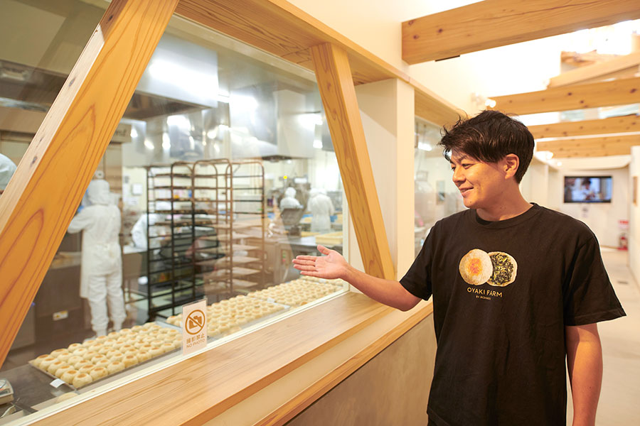 製造するおやきは毎日1 万個以上。ガラス越しに製造工程が見学できる。おやきづくり体験は要予約
