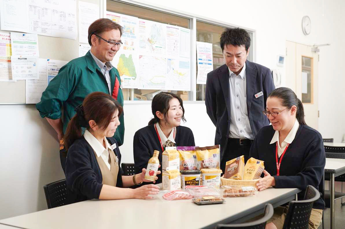 左から、総務部の細川美幸さん、渡邉店⾧、食品部の渡邊順子さん、小野英樹さん、福島佐恵さん