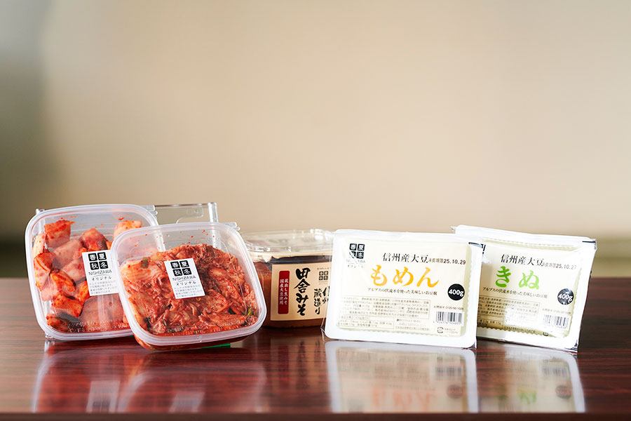 キムチは上田のキムフーズさんにお願いして、国産原料で企画しました。シャキシャキ感を残す独自の製法で、こちらのおいしさもお墨付き。いずれは県内の指定農園の白菜や大根を使えたらと思っています。