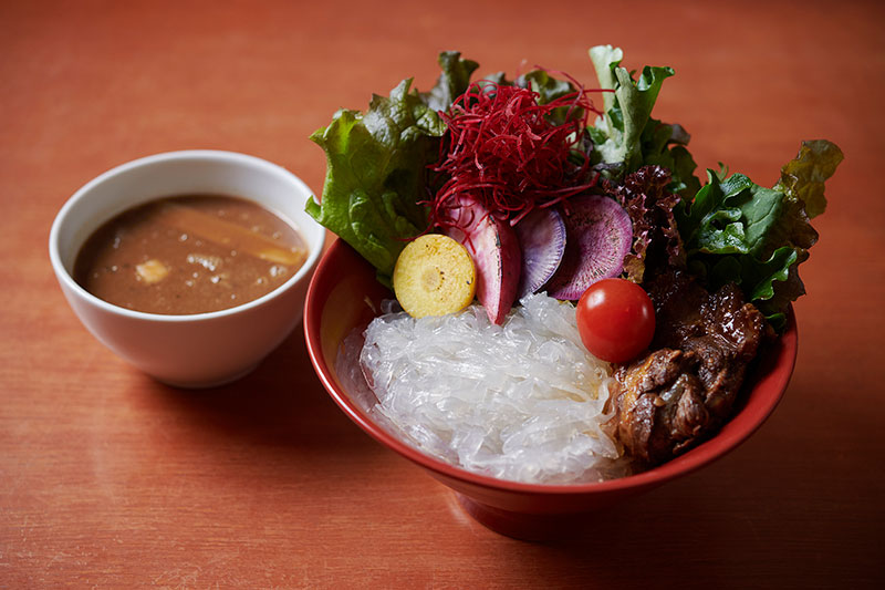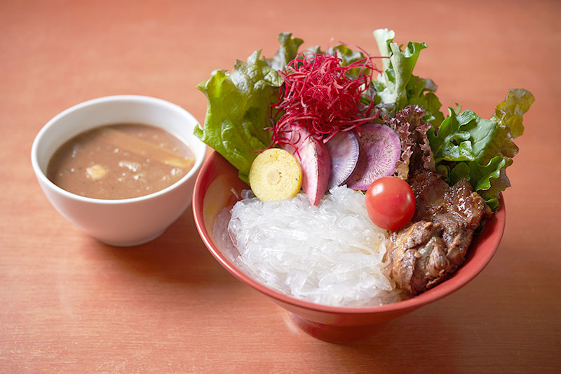注目していただきたいのは、4年ほど前に開発した「ベジもり」。お腹いっぱい食べても、罪悪感のないつけ麺をつくりたくて。麺は、じゃがいもとさつまいもが原料の国産春雨、グラスヌードル。ぷりぷり、もちもちの食感が楽しめます。