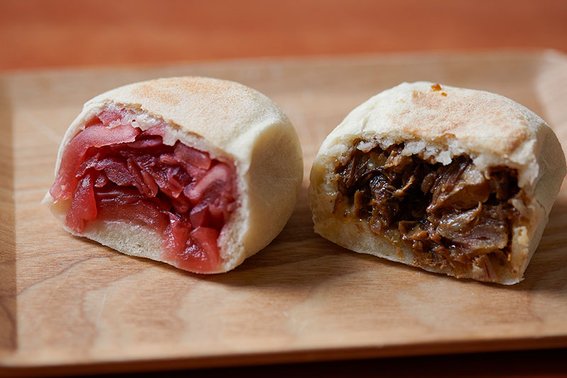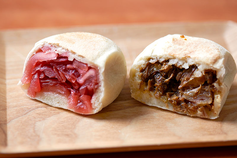 せっかくなら、ほかにはないおやきを作りたい。そこで、人気の豚軟骨を具材に入れようと、肉に合う皮のおいしさを追求した結果、イタリア・カプート社のピザ用の粉にたどり着きました。打ち粉は、パスタに使われるデュラムセモリナ粉。大判焼きの型で両面を焼いて、仕上げにコンベクションオーブンでサッと蒸し焼きにすると、パリッ、もちっとした歯ざわりに仕上がります。