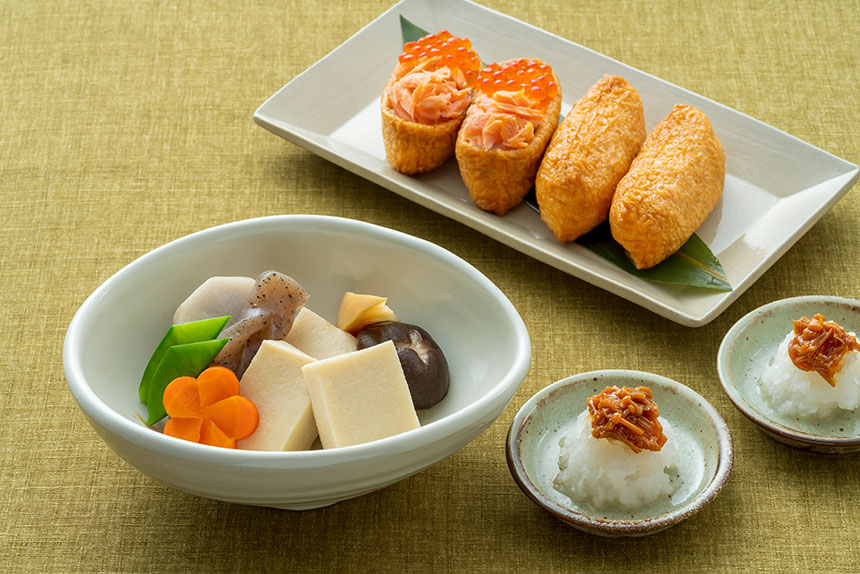 主力商品である味付けいなりあげは、常温保存が可能なレトルト加工と、味へのこだわりを重視したチルド加工(要冷蔵)の2タイプ。味わいも、昔ながらの甘じょっぱいものだけでなく、出汁を効かせたものや、砂糖とみりんでコクのある甘さに仕上げたものなど、多彩なバリエーションをご用意しています。