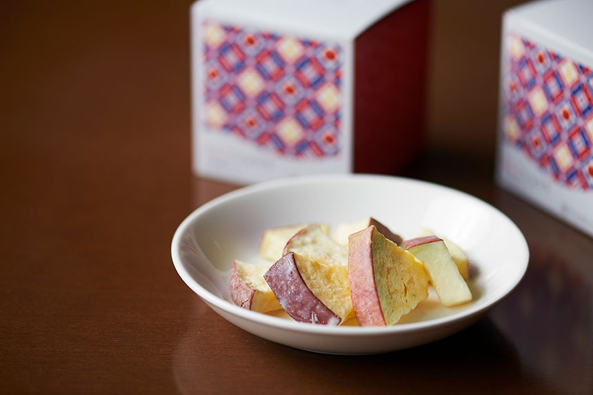 りんごは皮付きのままカットするのがポイント。栄養価の高さに加え、見た目にもりんごらしさが感じられます。りんごを一度フリーズドライにした後、真空状態でホワイトチョコレートを染み込ませています。